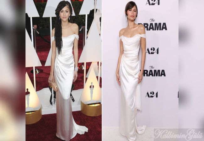 29 yaşındaki oyuncu, askısız, mavi ve siyah tüy desenli, kabarık etekli bir elbise giydi. "Magazin Habere" göre, elbise 27 farklı mavi tonunda 65.000 adet mavi ve siyah ham ipek tüyle süslenmişti. Zendaya, görünümünü ışıltılı gümüş ve mavi küpeler ve kalın, uyumlu bir yüzükle tamamladı. Saçlarını geriye toplamıştı ve uyumlu mavi göz farı dışında makyajı sadeydi.